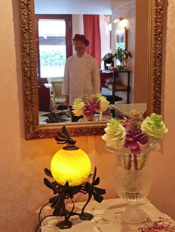 ●鏡の中は店主の松井知之さん。恒例のフランス研修から帰国されたばかりのところに、リヨンとパリのお話を伺いに出かけたのでした。帰り道のご苦労もしっかり伺いました。
