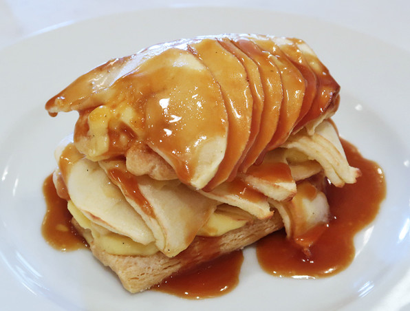 (りんごとサクサク、間にクレームパティシエール)✕3層、上から熱いカラメルブールサレ。