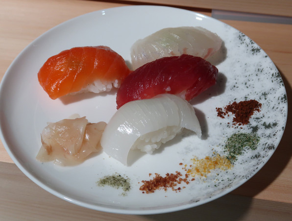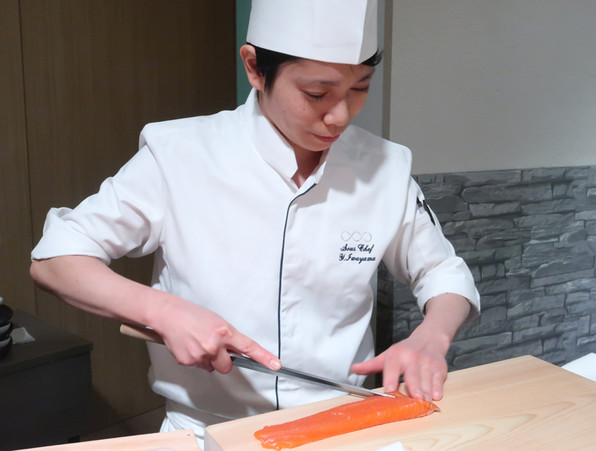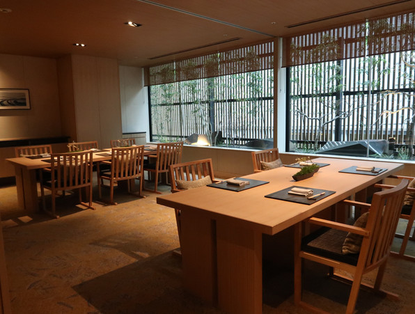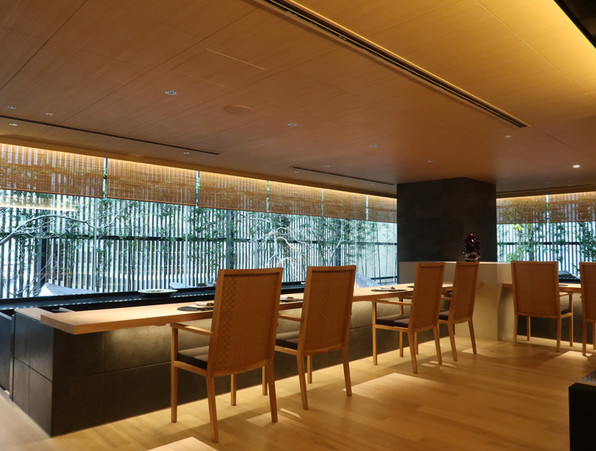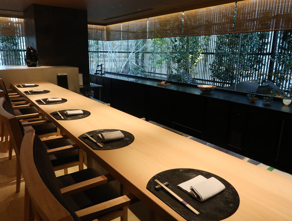 ●和食「KIZAHASHI(きざはし)」は60席、個室もあり。庭に面して自然光の入るカウンターやテーブル席はすごくゆったり作られています。特に寿司や天ぷらのコーナーがあるわけではなく、どの席でもお寿司も天ぷらも食べられるということ。炭火焼き台も見えるところにありました。