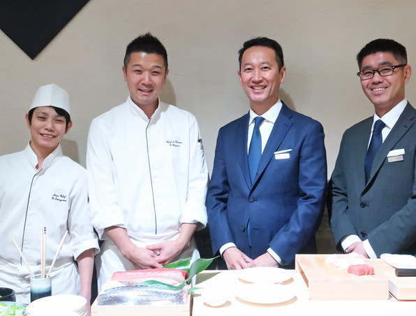 ●レセプション会場に行ってみたら、わわわ、ザ・リッツ・カールトン京都でお世話になった方々が、今はこのホテルの人となっていました。右側から、石井直毅さん、村山茂さん、早見義昭さん。