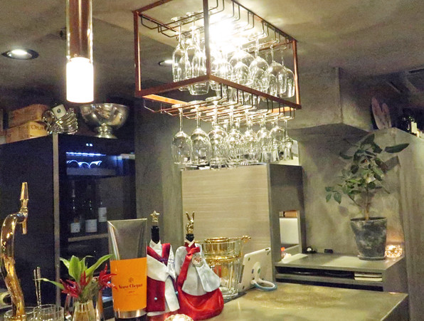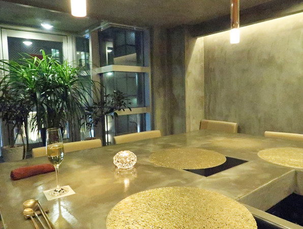 ●スタイリッシュな店内は8席、10席にもなるけれど、お鍋をするこんろは4箇所ということ。ふだんはゴールドの敷物で熱源部分は覆われています。