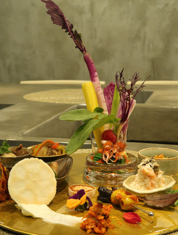 ・グラスのスティック状のサラダは底に仕込まれているサムジャン味噌をつけながら味わいます。日の菜、紫白菜、セロリ、黄にんじん、赤水菜。