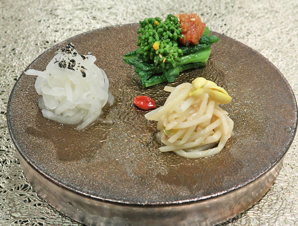 ●ナムル3種類、菜の花に明太子/豆もやし テンジャン/丸大根 胡麻油/くこの実 生姜のシロップ漬け、きび砂糖使用。
