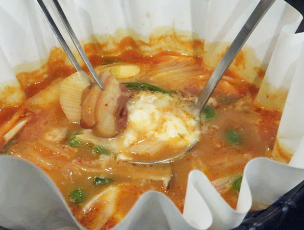 ●ノーザン(じゃがいも)やキムチやサラミ入りの鍋、煮立ったところにモッツァレラやブリーを投入して溶かし、麺をからめもって食べれば、もうもう天国です(*_*)(*_*) 熱い、ちょっと辛い、旨いいいいい~~www