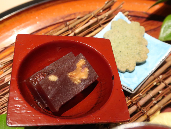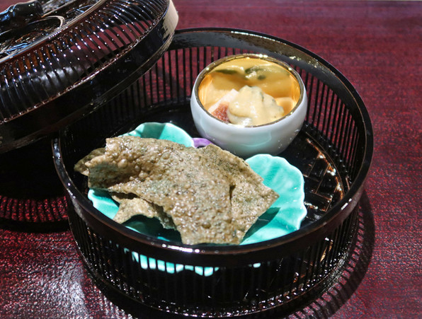 ●お茶が香り立つチップで、目覚ましい思いでした。パリパリ、ふわああああという感じ。奥の、粟麩の田楽の味噌にはお茶入り。お茶が隠しテーマのようです。