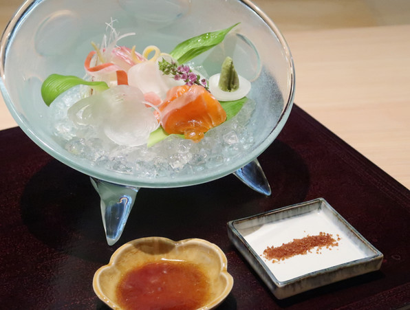 ●鯛と信州サーモン。モダンなガラス皿とうるいで春らしい感じ。