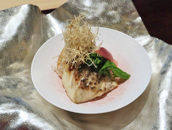 ●ひらすずきの焼きもの、後ろに海老芋唐揚。パリパリのごぼうに淀大根と、ひと皿の中で海と山、そして全く違う食感を味わえました。