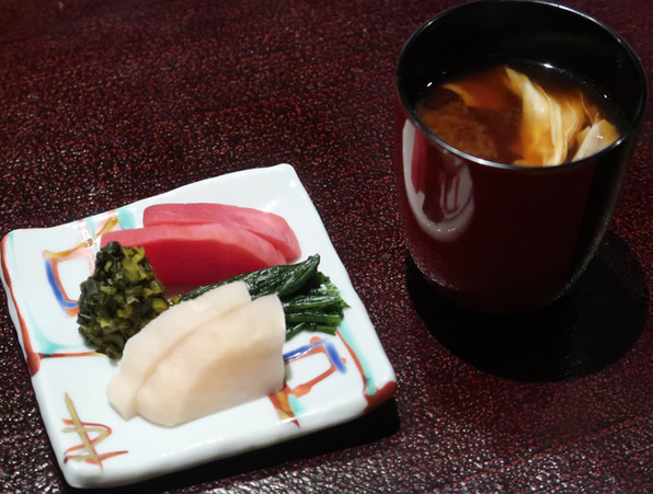 ●湯葉入りの赤だしと、香の物。すぐきが供され喜びました。