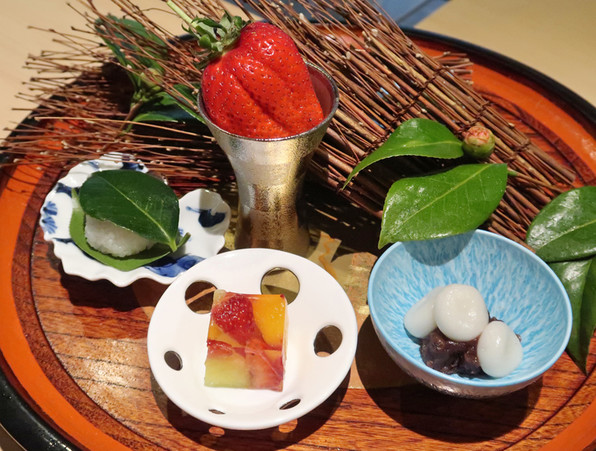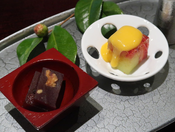 ●わたしは2種類選択。フルーツのジュレには、アングレーズソースがかけられました。これは「吉兆」さん風ですね(^o^) 手前はくるみといちじく入りの羊羹です。