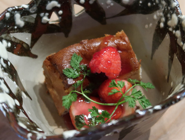 ●自家製のチーズケーキ、今回は焼いたものです。目の前で赤玉ポートワインでワインソースを作って(とろみは葛でww)さささと6皿かけて供してくださいました。
