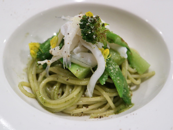 ●パスタはNP100、のろっちのパスタ100その82で、白魚に、つぼみ菜、スナップえんどう、西洋からし菜、菜の花。爽やかなバジル仕立てでものすごく春の味。うれし☆☆☆