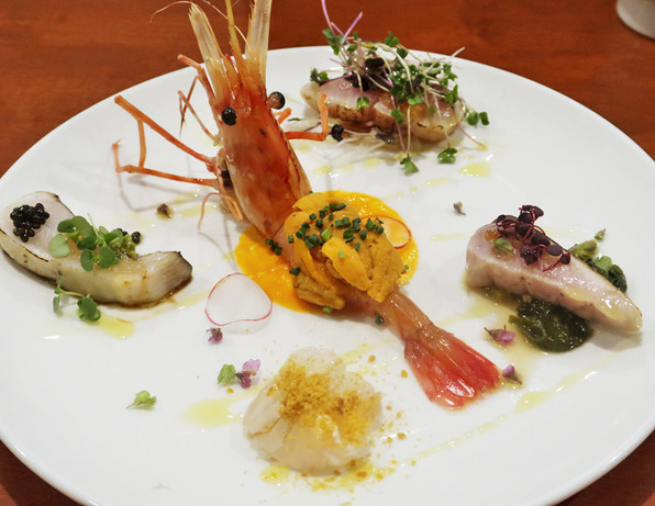 ●定番の魚盛りは小さめヴァージョンで、本当においしい魚をいい状態で食べさせてくれました。金目鯛、はまち、さざなみ鯛、まなかつお、雲丹を背負ったぼたん海老ww