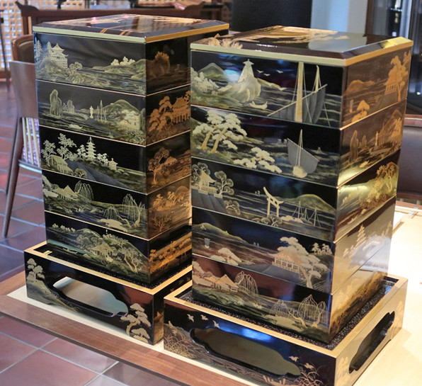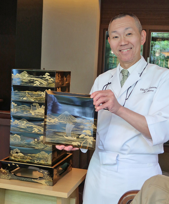 ●料理長の三浦雅彦さん。秘蔵の器でお料理を出してくださいました。いろいろありましたけれど、絵変わりの蒔絵とお重がとりわけ美しく、みんなで回しもって眺めました。