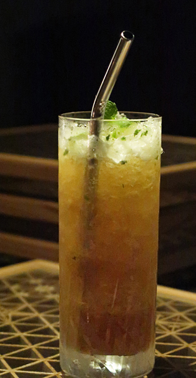 ほうじ茶インフュード六ジン、ミント、ほうじ茶、白桃シロップ、フレッシュライムジュース。