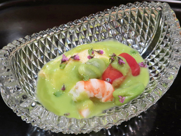 ●えんどう豆すり流し、たまご豆腐、フルーツトマト、海老