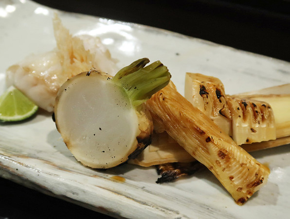 ●焼き物で、塚原の筍と水沢農園のかぶら、白甘鯛、うろこバリバリも美味。