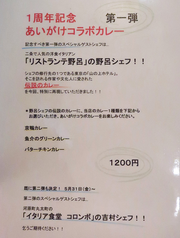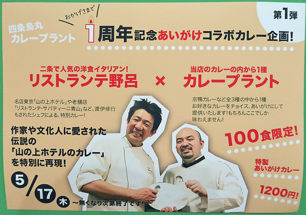●四条烏丸からほど近くにあるカレー専門店「カレープラント」さん(初出はこれ)、1周年記念で、楽しいコラボカレーイヴェントが始まりました。