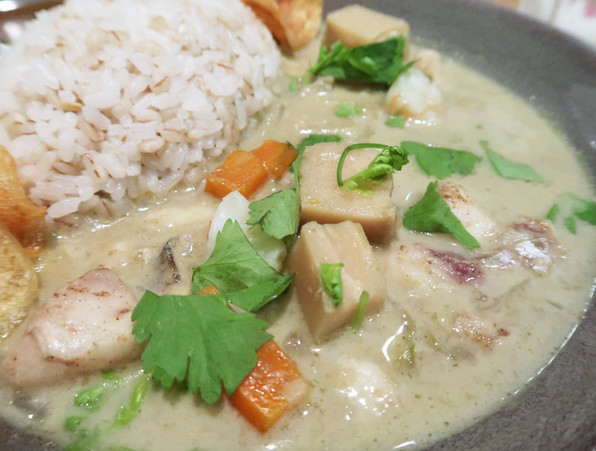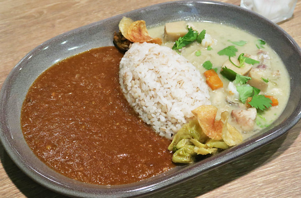 ●今回あいがけにしたのは、山の上ホテルカレーとは明らかな差異をつけるべく、魚介グリーンカレー。