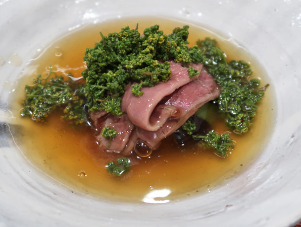 とりわけ、お椀(とり貝、じゅんさい、玉子豆腐)と、賀茂茄子と京鴨に花山椒をのせた炊き合わせに心を奪われました。