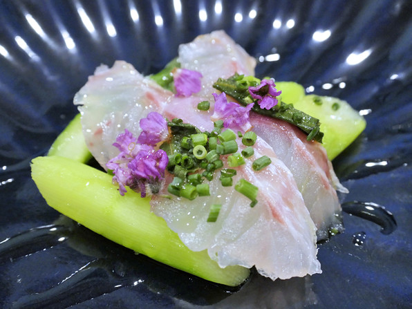 ●「よこしまふえだい」という鯛、グリーンアスパラガスを茹でたの、えごま醤油