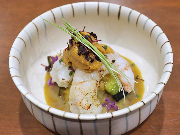 ●賀茂茄子胡麻和え、牡丹海老炙り、雲丹、芽ねぎ