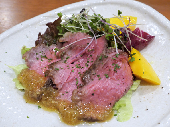 ●黒毛和牛、ランプ肉のローストビーフ、宮崎マンゴー