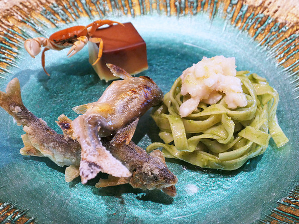 ●バジルではなくたでで作ったジェノヴェーゼソースでタリアテッレ。上のもろもろは鱈の白子とししゃもの塩漬けで作ったもの。香りと塩気を添えていました。迫力があっておいしかったー☆☆☆