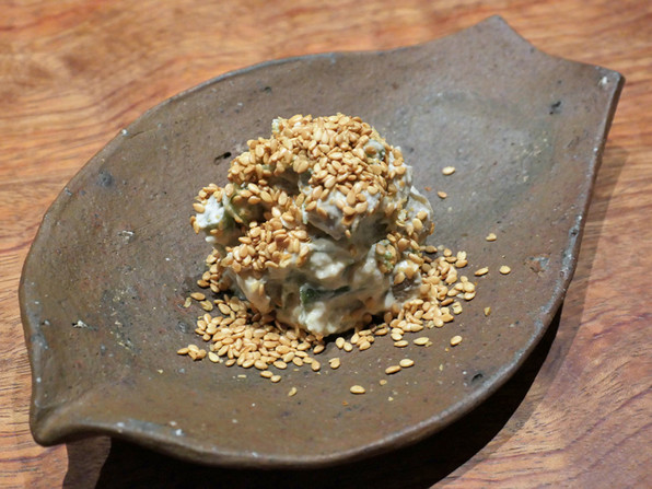 ●胡麻和えは、新じゃが、酢取りにしたごぼう、三度豆、にんじんの葉。