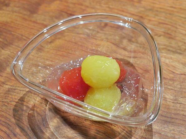 ●食後の甘味というかひたすらさわやーかなひと皿、トマトとトマトのジュレ、ほんのり甘い仕立て。するりつるりといただけて、夏の夜にふさわしい締めだなあと。
