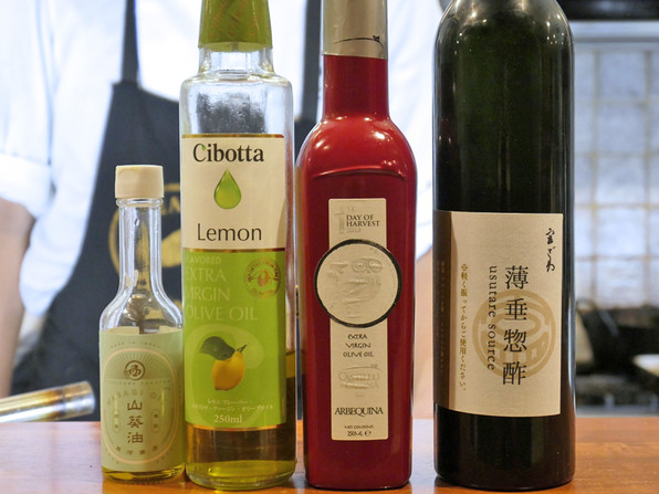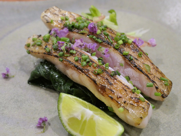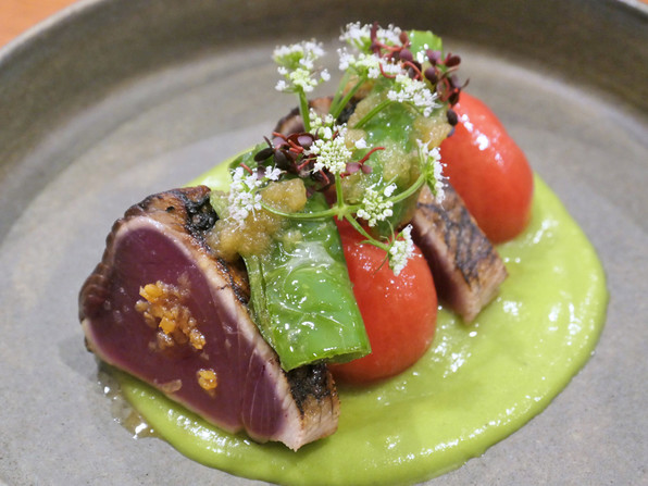 ●かつおのたたき 万願寺とうがらしと山椒のピュレ、トマト、せりの花