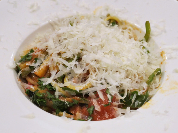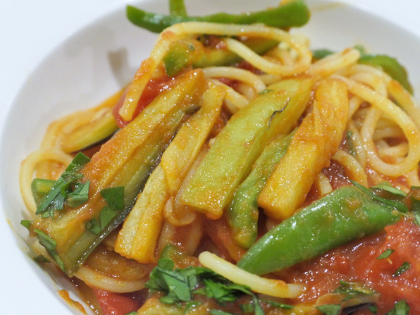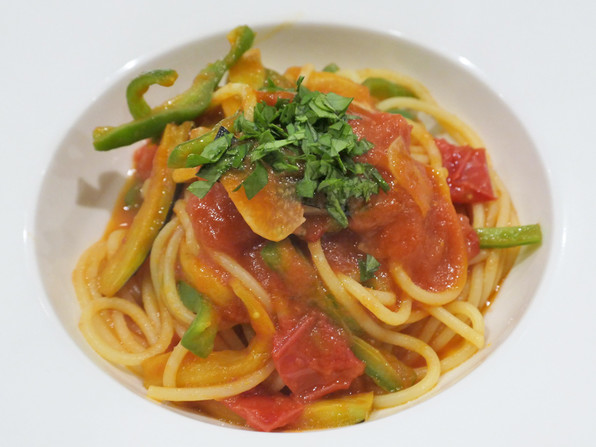 ●NP100、その98 茄子と万願寺とうがらしのスパゲッティ、トマト風味、追いフォルマッジョ
