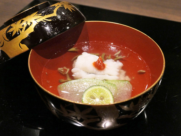 ●牡丹鱧のお椀 冬瓜、じゅんさい、車すだち、梅肉