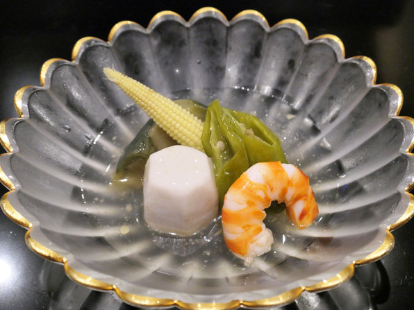 ●車海老、青唐、小芋、ヤングコーン 生姜あん