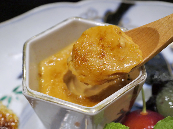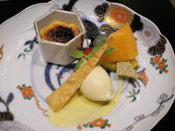 ●塩カラメルのブリュレ、ヴァニラのアイスクリーム、メロン、巨峰、佐藤錦 アングレーズソース