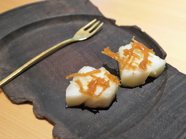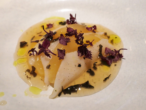 ●食前酒ひと口の後、ひと皿めです。桃の昆布締めと蛸(これはいか)。木の芽油。