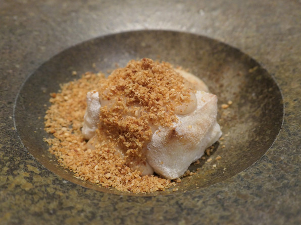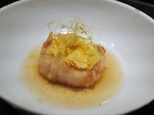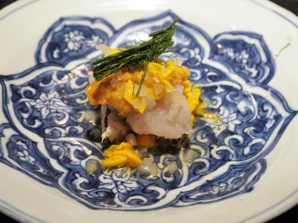 ●鱧を炭火の焼霜で。青森の雲丹、八代の海苔。煎り酒。南瓜と玉ねぎを乳酸発酵させたもの。