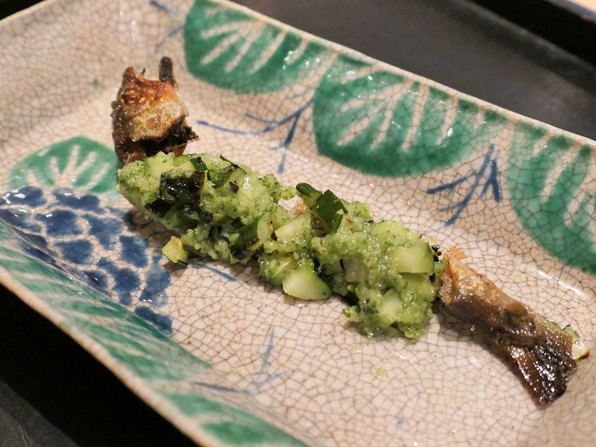 ●鮎の頭と尾、骨をバリバリに揚げたもの。きゅうりを炭火焼きにしておろしたものを、魚醤と。