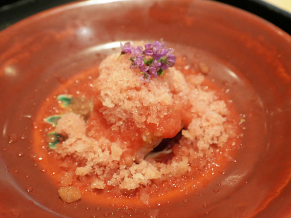 ●車海老、その海老の頭と殻の香りを移した油。上に高知のトマト、トマトのふんわりしたのと冷凍でシャリシャリしたのと。