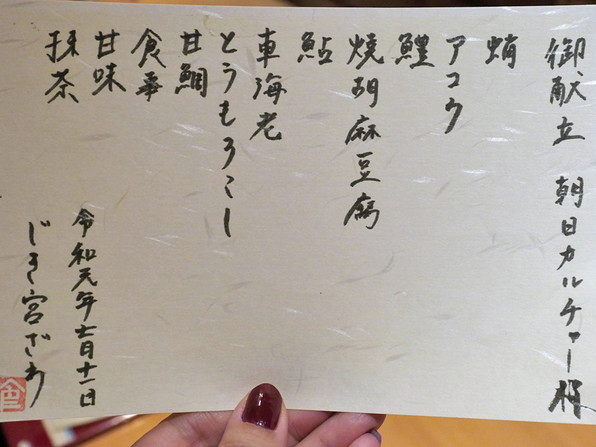 ●この献立を見るだけではわかりません。ひと皿に食材を多彩に使って意表を突く、それでいて本当においしい料理を次々に出してくださいました。