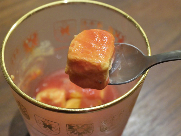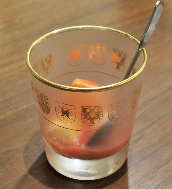 ●冷たいグラスで供された、赤ピーマンのムースグラッセ、トマトのクーリと。