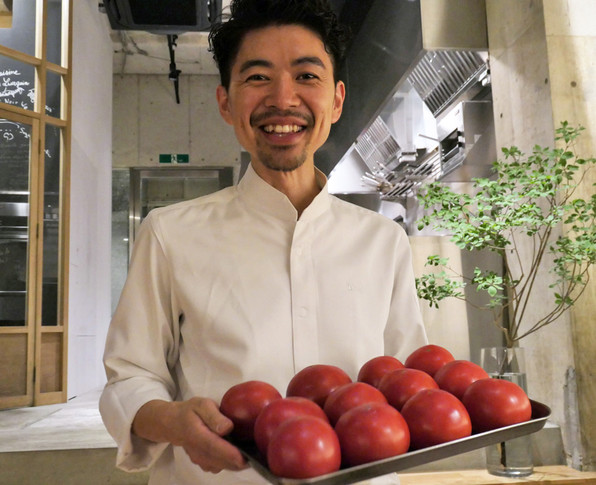 ●店主の森永宣行さんです。上賀茂の、いかにもおいしそうな真っ赤なトマトをプレゼン。