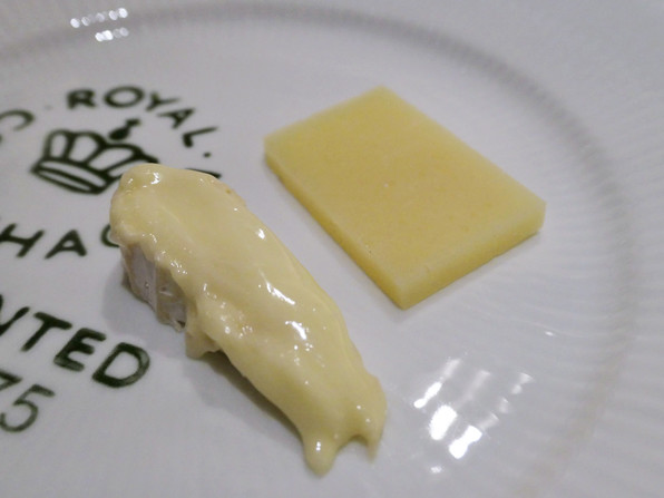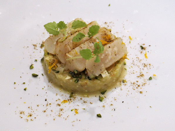 上に帆立貝。ピスタチオ、アーモンド、レモンバームの葉。和歌山のヴァレンシアオレンジの皮が馥郁たる香りを放っています。オレンジだけでなく、エピスいろいろがふわあああああと香りが立って、ここはどこにいるのか?という気分になりました。完全に別世界に来たような心持ちです。