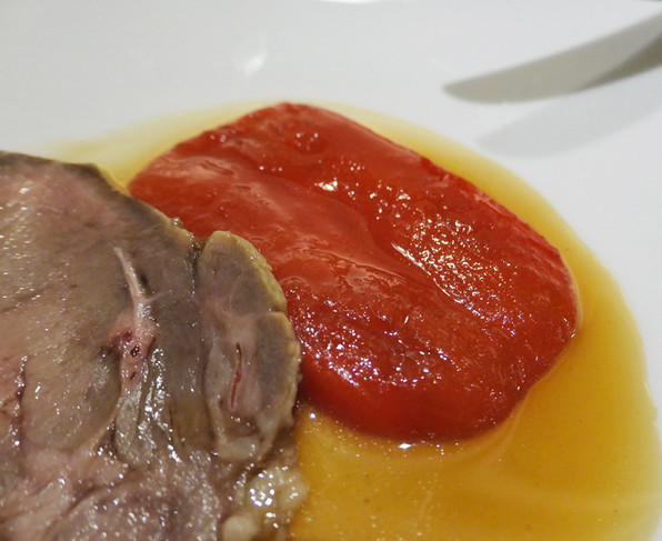 ●合わせたのはふんわりしっとり柔らかくした赤パプリカ、エストラゴンの香りのコンソメと。