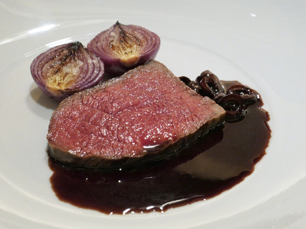 ●岩手の牛肉の内もも肉、溶岩グリエに、プロヴァンス風にオリーヴの香りをつけた赤ワインソース。