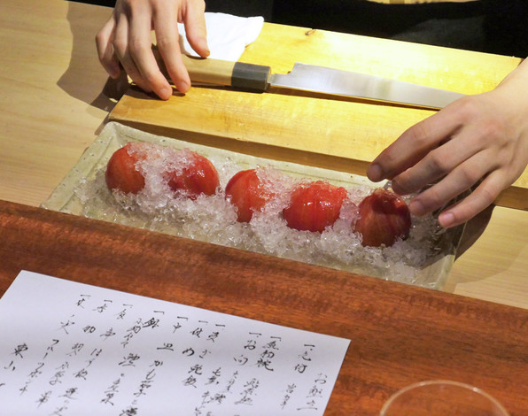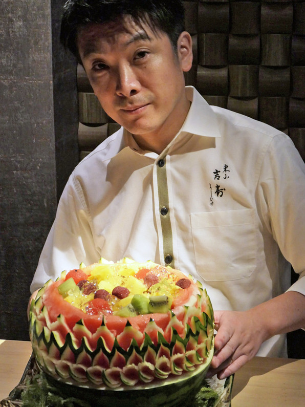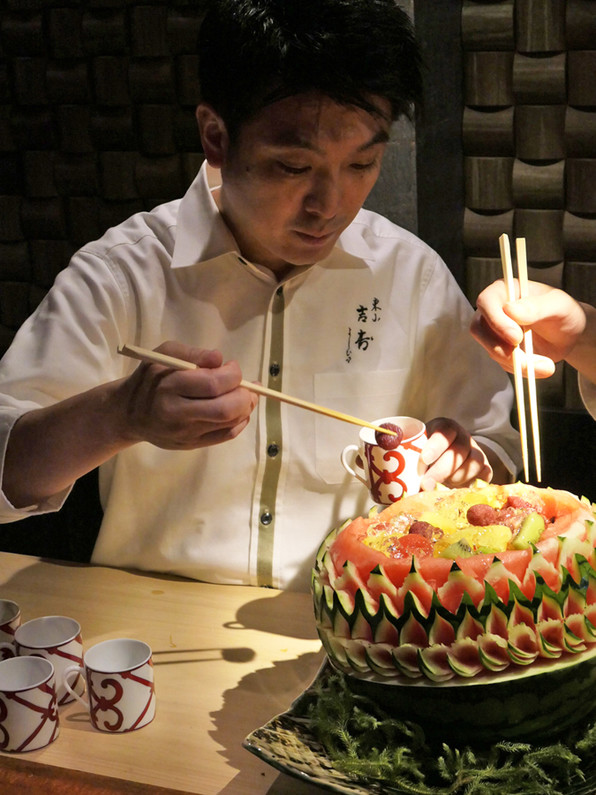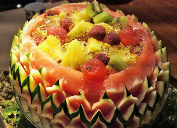 ●吉寿さんお得意のカーヴィングを施されたすいかでフルーツポンチ。このカーヴィング、「30分くらいでできた」とのことだけど、見事なものでした。