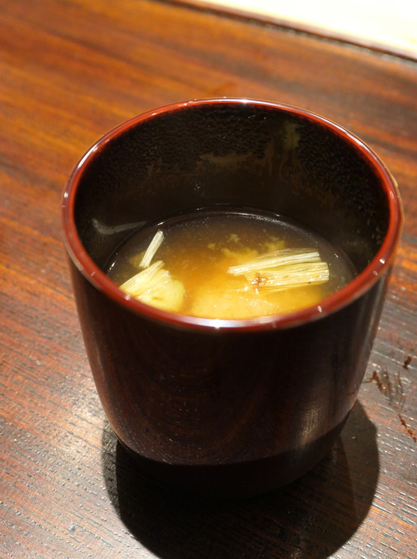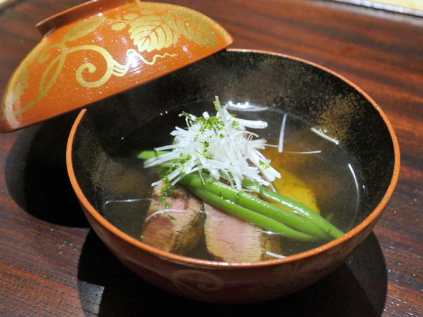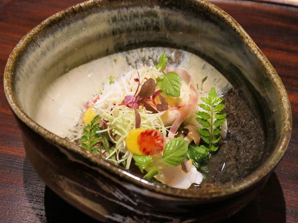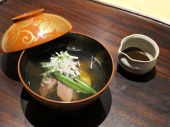 黒文字のアンフュージョン(!!)とかつおだしベースのスープ。