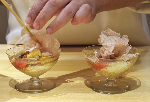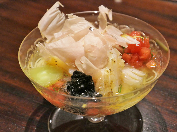 トマトの透明なジュと水出しかつおだしを合わせたもの。