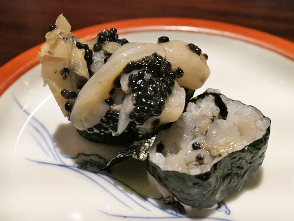 カヴィア、ものすごく風味のいい、味わい濃厚なトマト。焼き鮑も!