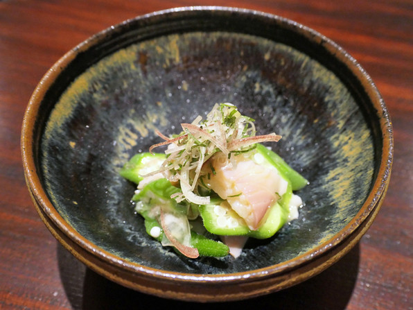 ●酢の物はほっき貝と太秦のおくら、土佐酢、すだち、大葉、茗荷