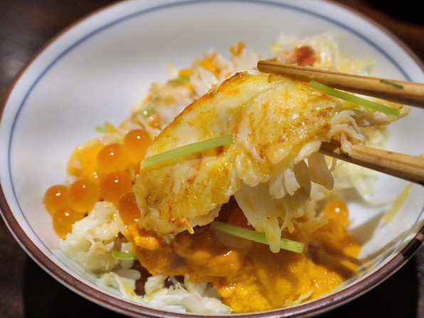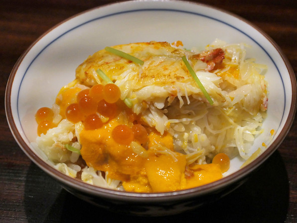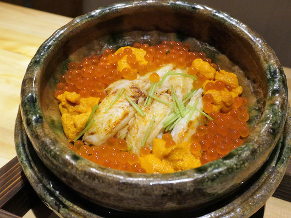 毛蟹(バターソテ)、雲丹、いくら。目の前で仕上げしてくださって、どんどん雲丹のせる、いくらのせる。かっちょいいわ・・・